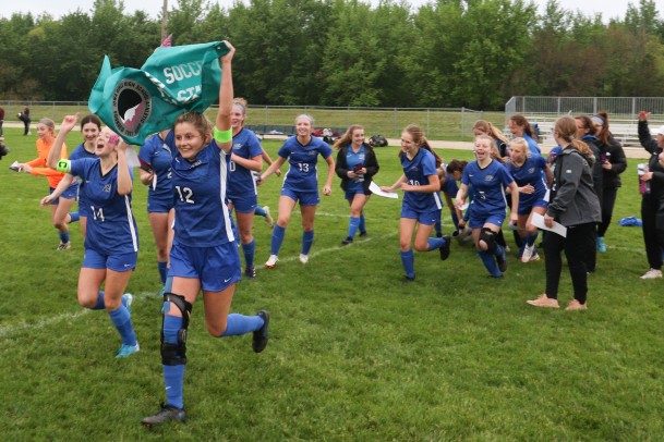 Becca Jorgensen (12) runs over to D-NH fans with the Wolverines' state-qualifier banner after a 2-1 regional final victory over Denver on Thursday. (Jake Ryder photo)