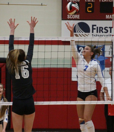 Dike-New Hartford's Morgan Weber (right) hits an attack during a match with Forest City earlier this season. Weber was named as the NICL East Volleyball Player of the Year. (File photo)