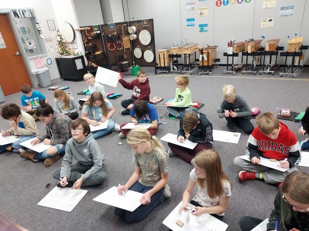 Recently, fourth graders notated the four pitches on the treble clef staff that they learned to play on recorders. The dry-erase boards allowed students to share ideas, demonstrate their notation and composition ideas and making the most of the music class.