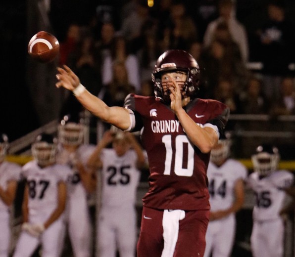 Logan Knaack, pictured here throwing in a game against Hudson earlier this season, chucked five touchdown passes in Grundy Center's 40-0 win over Nashua-Plainfield on Friday. (Tyler Meyers Photography photo)