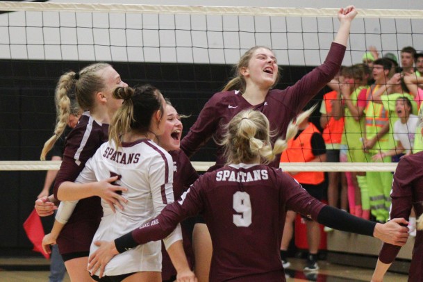 Grundy Center players celebrate the game-winning kill by Paige Venenga (fist raised) in the Spartans' 3-0 win over South Hardin on Tuesday, Sept. 6. (Jake Ryder photo)