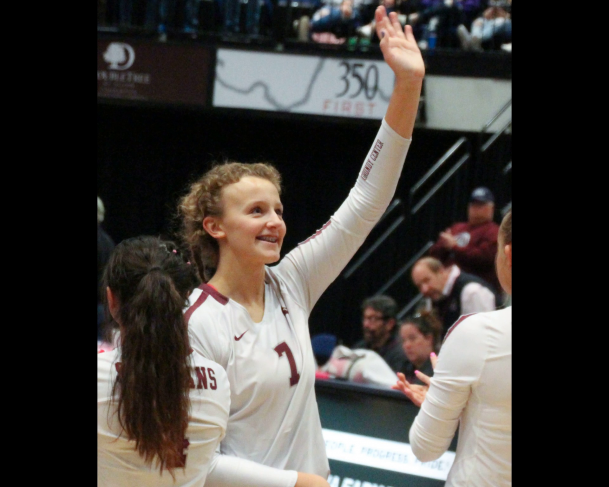 Grundy Center's Leslie Homeister waves to the crowd during introductions for a state quarterfinal volleyball match with Osage at the U.S. Cellular Center in Cedar Rapids last fall. The Spartan senior announced she will join Coe College women's volleyball. (Jake Ryder photo)
