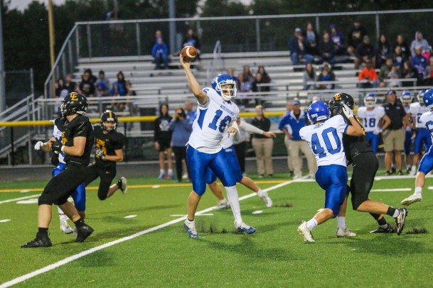 D-NH's Benton Bixby fires off a pass attempt during Friday's game in Clear Lake. (Chris Barragy/Mid-America Publishing photo)