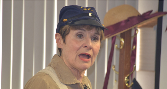 Renowned stage performer Pippa White presented her newest show “On Our Own Soil” to a large crowd at the Grundy County Museum in Morrison Sunday. White’s one-person show took the audience through the Civil War as she portrayed characters male and female from both the Union and Confederate sides of the battlefield. Using different voice intonations and a variety of hats, White’s portrayal of the bloodiest war fought on American soil was unique. White has performed throughout the Midwest and beyond. She currently has no fewer than nine different shows that she tailors to different audiences she performs before. (John Jensen/The Grundy Register photo)