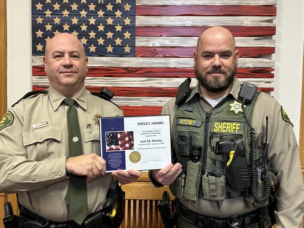 Grundy County Sheriff Kirk A. Dolleslager (left) presents a 20-year service award to Deputy Josh M. Ritchey. (Contributed photo)