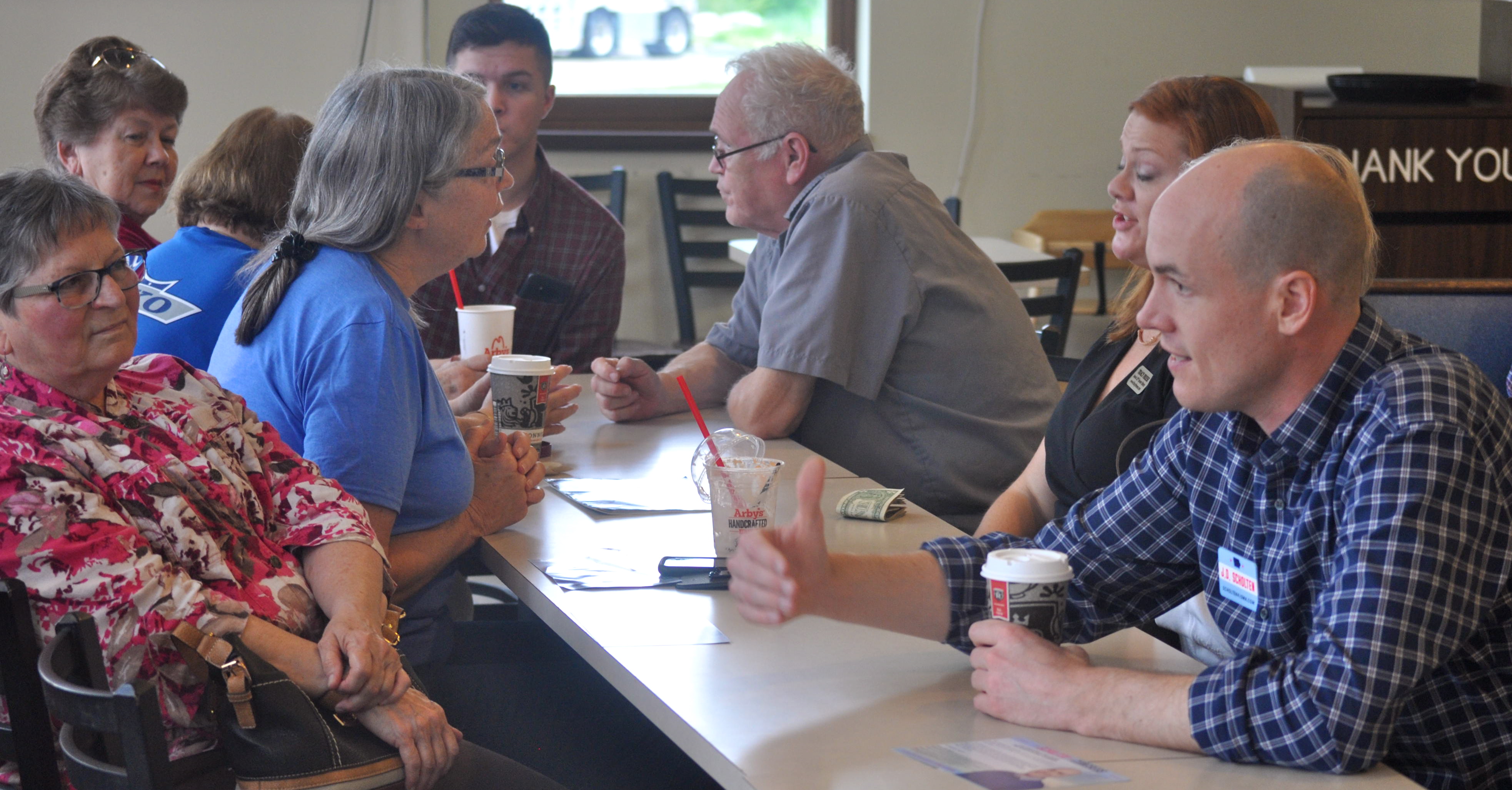 With nothing but the open highway in front of him, a massive RV nicknamed “Sioux City Sue” and an expansive district sprawling from Inwood to New Hampton to cover, Democratic congressional candidate J.D. Scholten is doing everything he can to reach as many voters as possible before the June 5 primary. Last Monday, the bus stopped at The Mill, allowing the former minor league baseball player to meet with prospective constituents along with his friend Tracy Freese, a state senate candidate from Dike.