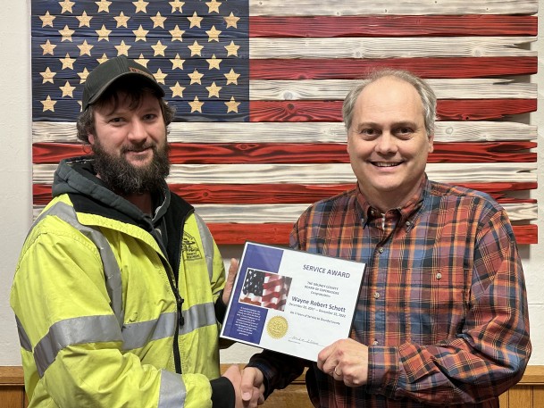 Wayne Robert Schott (left) was recognized for five years of work with the Grundy County Secondary Roads Department. He is pictured with County Engineer Gary Mauer. (Photo courtesy of the Grundy County Courthouse)