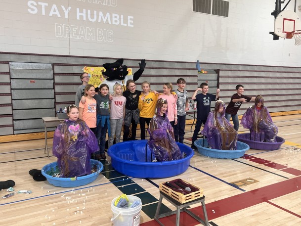 As part of a celebration at the end of a UNI Dance Marathon fundraiser, Grundy Center Community Schools held a final presentation in the Elementary School gym on Feb. 24. Spartan Senators also agreed to be turned into human ice cream sundaes as part of the festivities. A total of over $4,000 was raised for the University of Iowa Stead Family Children’s Hospital. (Photo from Facebook)