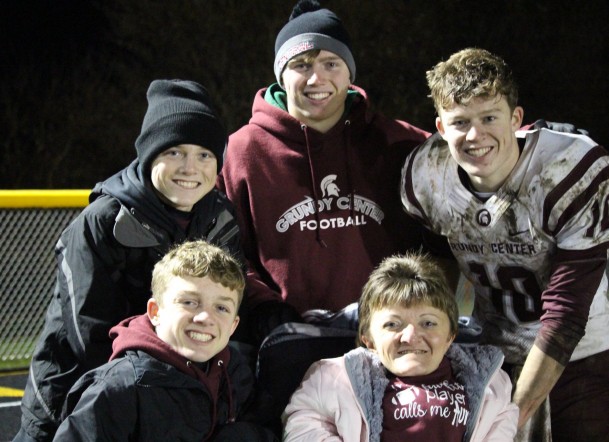 Jill Thompson takes a photo with her nephews – Austin, Logan, Dylan and Justin – after a Grundy Center football game in 2019. Jill has been in attendance for every Grundy Center football game since Austin's senior year – and she plans to keep attending games while the Knaacks are suited up in maroon and white. (Photo from Facebook)