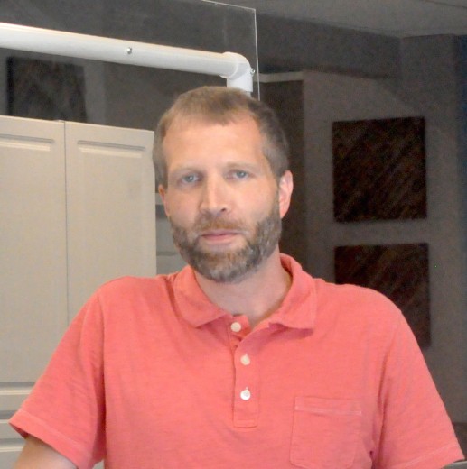 Center Theater Manager Mike Steinmeyer (pictured) stands by the new plastic dividers over the concession stand as the theater has reopened on a trial basis while also offering curbside snacks. (Robert Maharry/The Grundy Register photo)