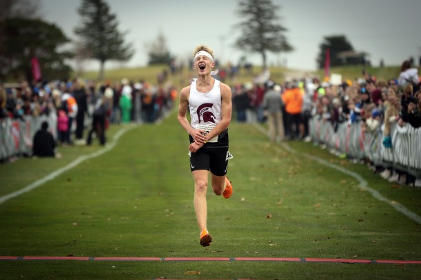 State champion hype! Grundy Center junior Emerson Vokes crosses the finish line in the Class 2A boys race at the 2024 State Cross Country Championships on Saturday, becoming the first Spartan runner to win a State title.