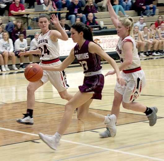 Grundy Center’s Paiton Wallis dribbles around South Hardin's Cora Frohwein (24) and Meghan VandePol (right) during NICL West basketball action Monday. Wallis scored a game-high 22 points and made six of the team's 11 three-point goals in the lopsided 54-9 victory. (Scott Bierle/Mid-America Publishing)