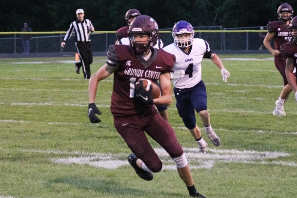 Grundy Center's Tate Jirovsky runs up field after making a catch in the first half against AGWSR. (Jake Ryder photo)