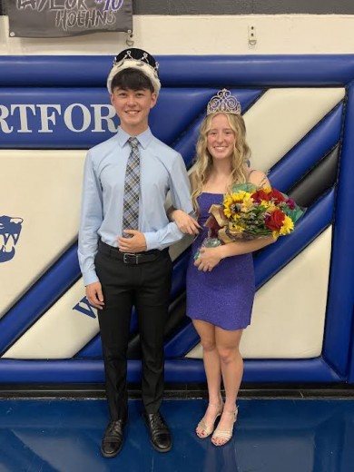Nolan Dall (left) and Lexie Fager (right) were crowned the 2021 Dike-New Hartford homecoming king and queen during the coronation last Friday afternoon. The Wolverines got a big win over East Marshall that night and celebrated with various festivities throughout the week. (Photo via Jerry Gallagher)