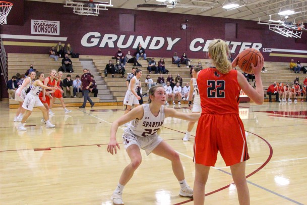Grundy Center's Dahlia Gardiner guards Roland-Story's Madeline Morton during Thursday's girls basketball game in Grundy Center. (Jake Ryder photo)