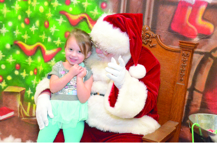 The sweet sights and sounds of Christmas came to Grundy Center Saturday, as the Chamber of Commerce hosted its annual Village of Lights celebration. Pictured, 3-year-old Kinsley Woodley of Aplington takes her turn on Santa’s lap during visits hosted by GNB. (John Jensen/The Grundy Register photos)