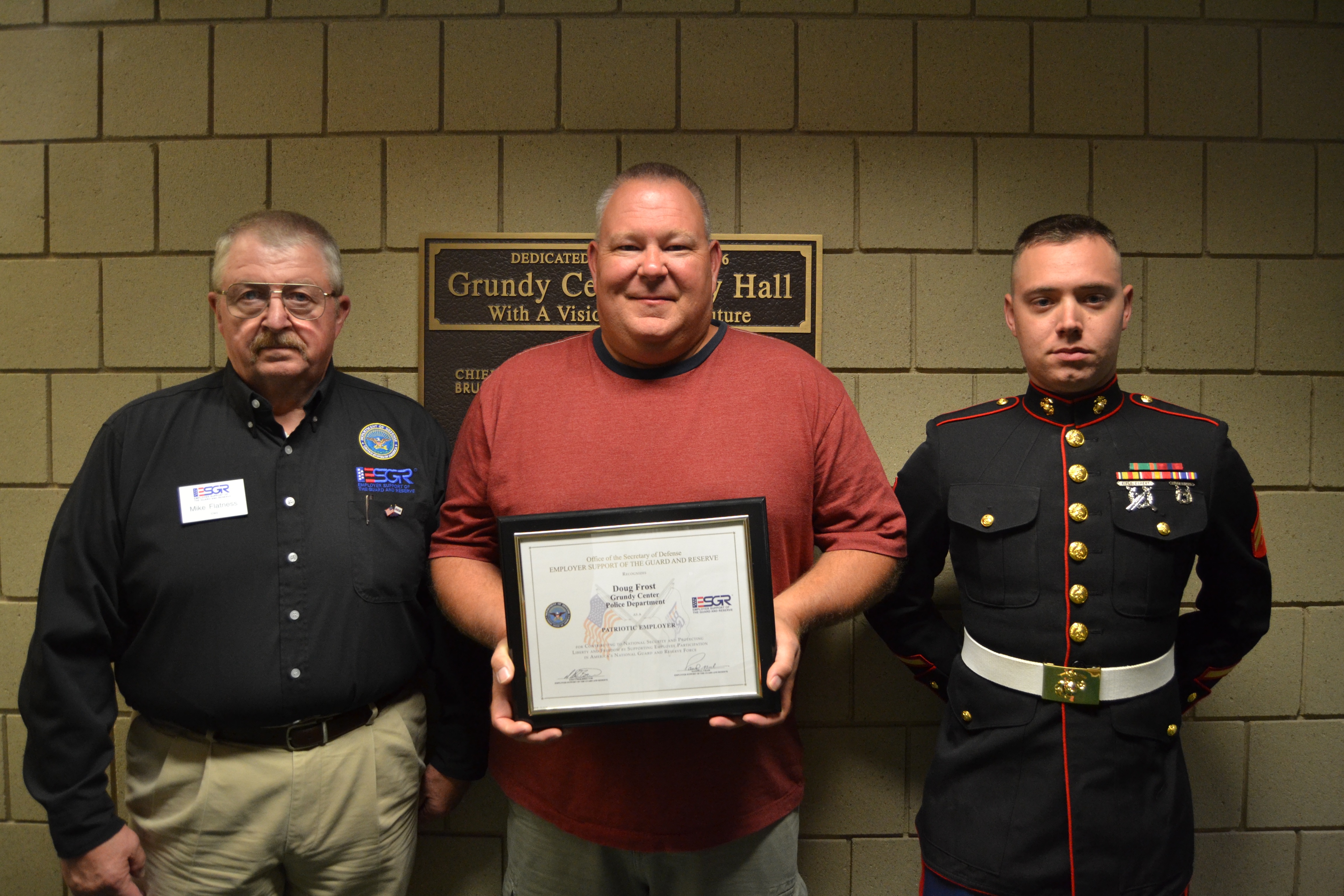 GRUNDY CENTER – Grundy Center Police Chief Doug Frost was recently honored with the Patriotic Employer Award from the Iowa Committee for Employer Support of the Guard and Reserve (ESGR), an agency of the Department of Defense.