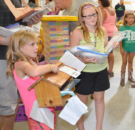 The Grundy County Fair kicked off Monday with judging and check-in of non-livestock exhibits. Pictured, sisters Olivia and Gabrielle Patrick have their hands full with projects they are exhibiting at this year’s Fair. (John Jensen/The Grundy Register photos)