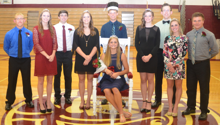 Katie Lindeman (front center) and Jordan Graham (back center) were named Grundy Center High School’s Homecoming Queen and King during a pep rally at the High School gymnasium last Thursday. Katie is the daughter of Matt and Jan Lindeman while Jordan is the son of Dave and Sue Graham. They are pictured with other members of the Court, including (left to right): Blake Henningsen, Kayla Mathews, Austin Burroughs, A;yssa Mathews, Lindeman and Graham, Kaitlynn Ehrig, Jack Beck Brunk, Piper Johanns and Grant Weldon. (John Jensen/The Grundy Register photo)