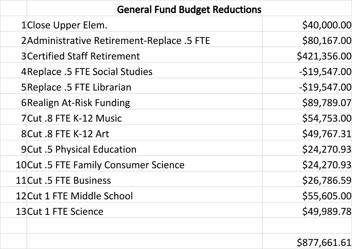 The list of proposed reductions includes one full time equivalent (FTE) at the middle school, one FTE in science, .8 FTE in both K-12 music and art, .5 FTE in family consumer science and business and .25 FTE in technology integration. It also includes the already announced process of closing the Upper Elementary building, dropping transitional kindergarten and replacing a retired administrator with a half-time administrator.